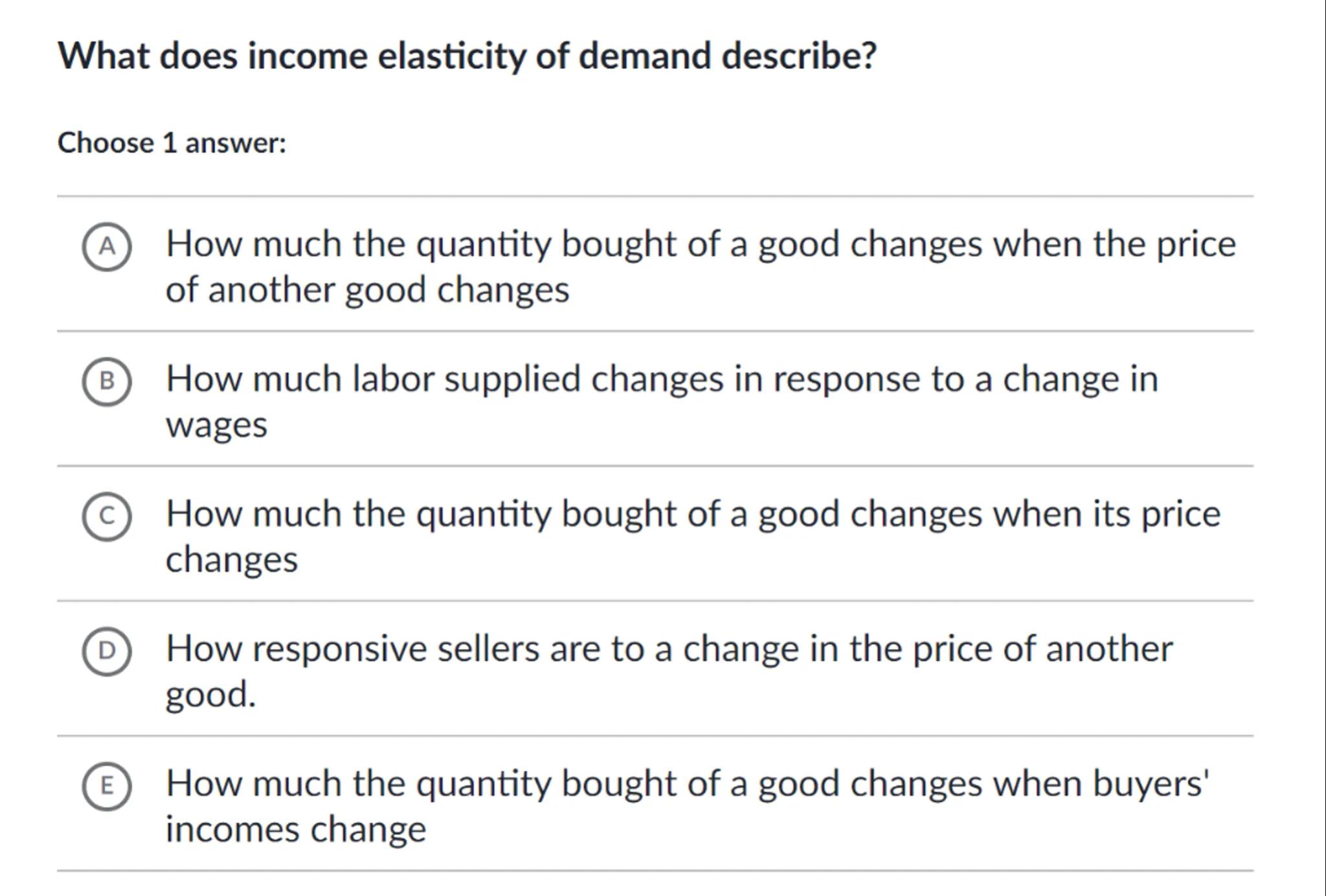 (E) How much the quantity bought of a good changes when buyers' incomes change