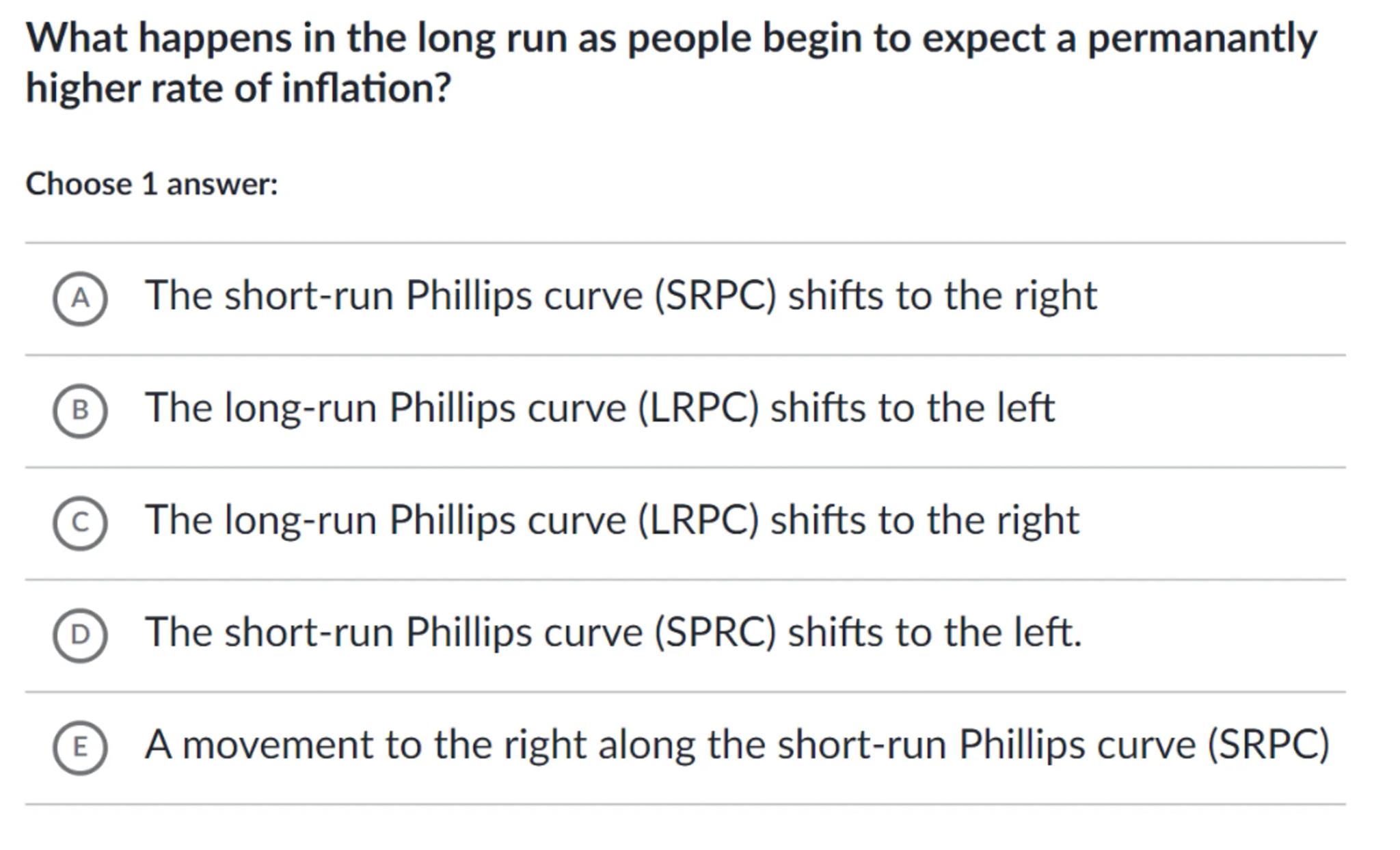 (A) The short-run Phillips curve (SRPC) shifts to the right