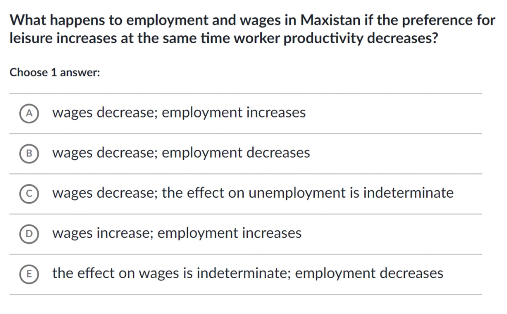 What happens to employment and wages in Maxistan if the preference for leisure increases at the same time worker productivity decreases?