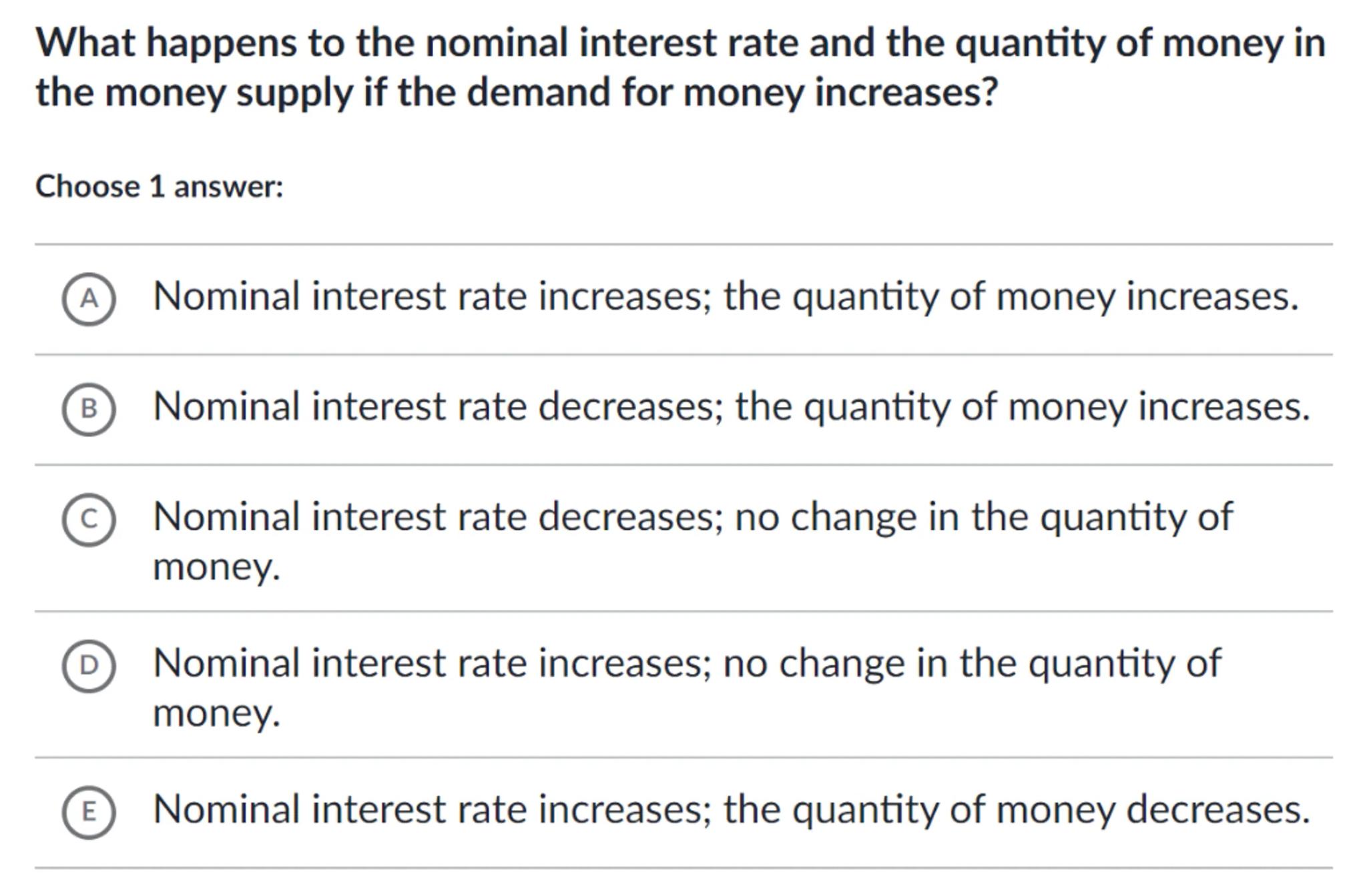 (E) Nominal interest rate increases; the quantity of money decreases.