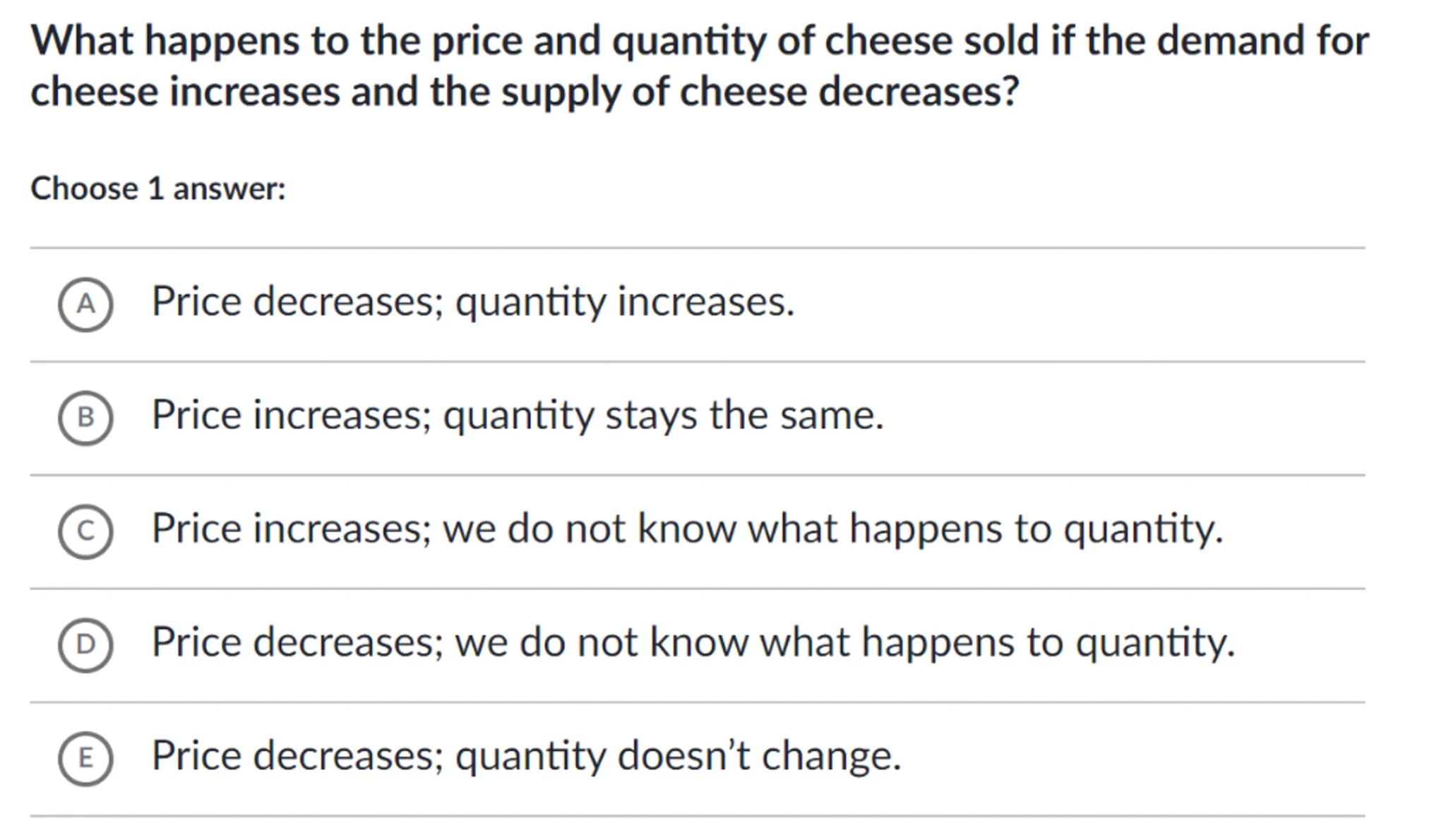 What happens to the price and quantity of cheese sold if the demand for cheese increases and the supply of cheese decreases?