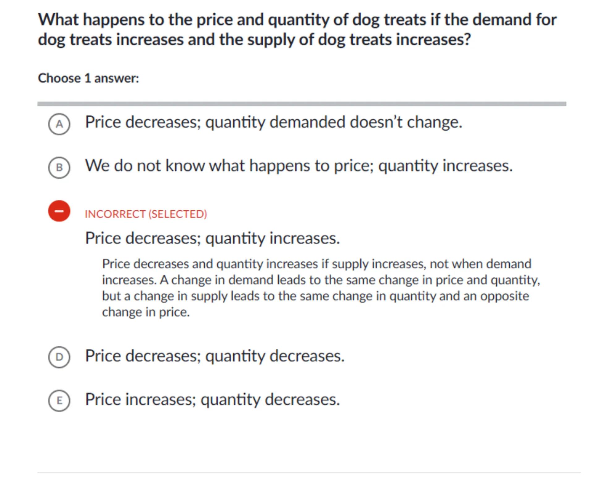 What happens to the price and quantity of dog treats if the demand for dog treats increases and the supply of dog treats increases?