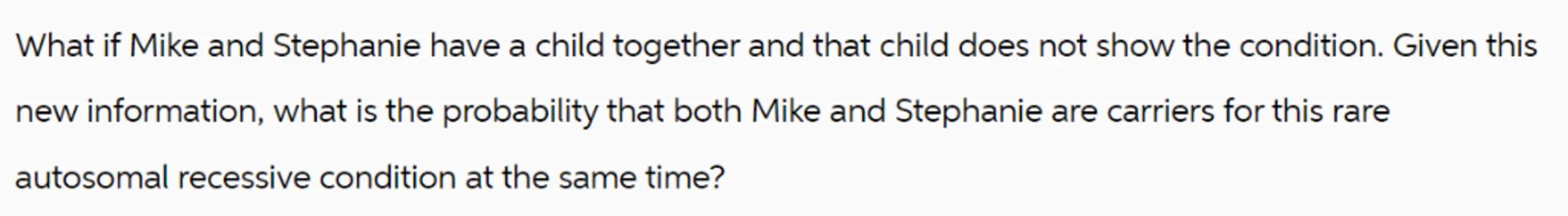 What if Mike and Stephanie have a child together and that child does not show the condition. Given this new information, what is the probability that both Mike and Stephanie are carriers for this rare autosomal recessive condition at the same time?