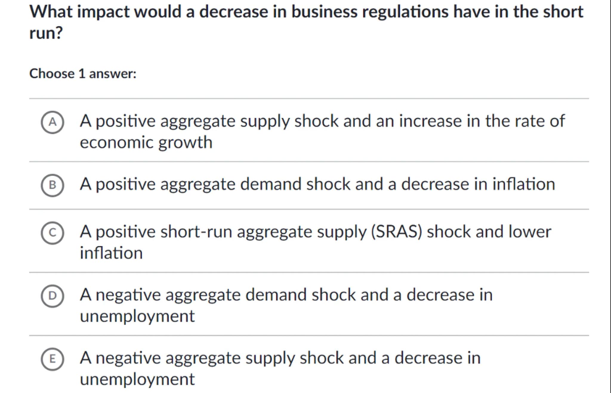 (C) A positive short-run aggregate supply (SRAS) shock and lower inflation