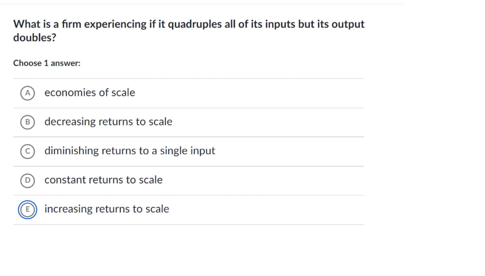What is a firm experiencing if it quadruples all of its inputs but its output doubles?