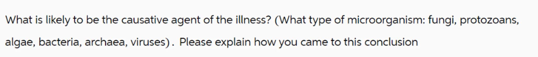 What is likely to be the causative agent of the illness? (What type of microorganism: fungi, protozoans, algae, bacteria, archaea, viruses). Please explain how you came to this conclusion