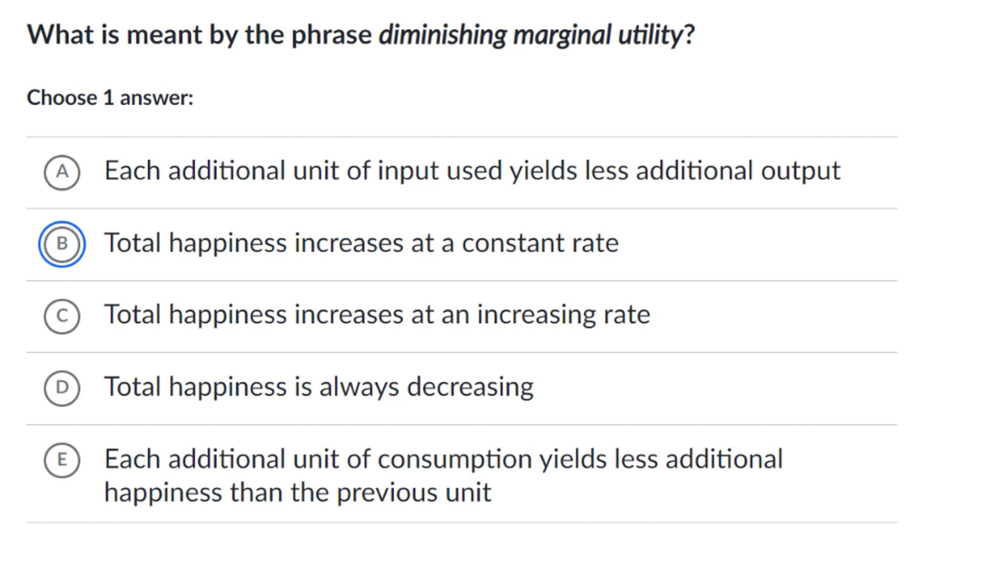 (E) Each additional unit of consumption yields less additional happiness than the previous unit
