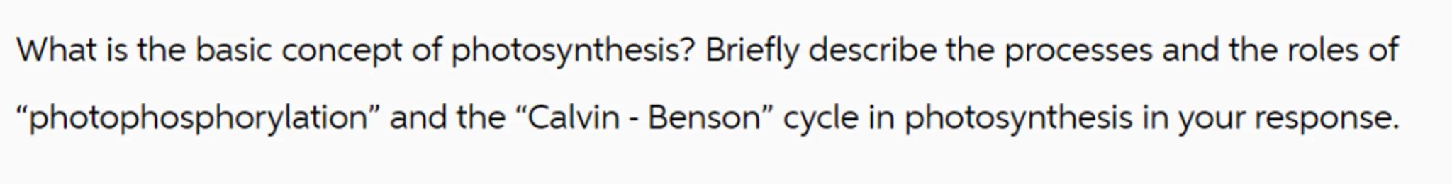 What is the basic concept of photosynthesis? Briefly describe the processes and the roles of "photophosphorylation" and the "Calvin - Benson" cycle in photosynthesis in your response.