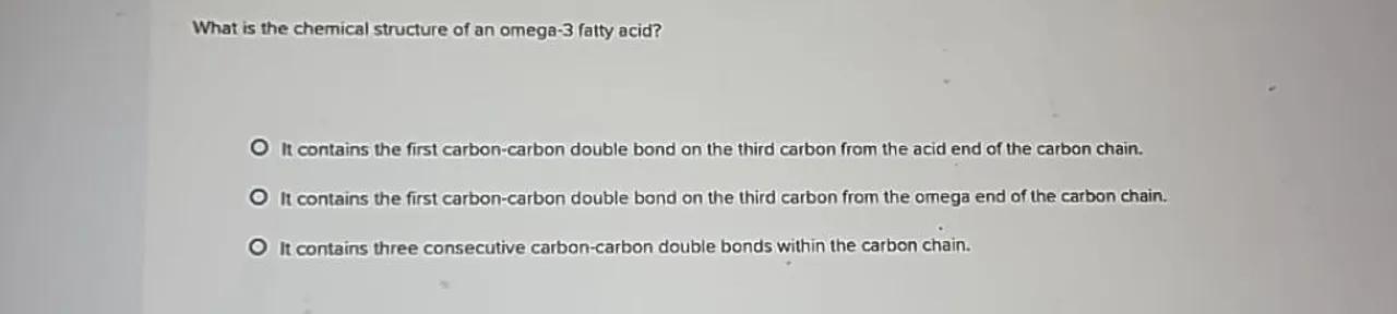 It contains the first carbon-carbon double bond on the third carbon from the acid end of the carbon chain.