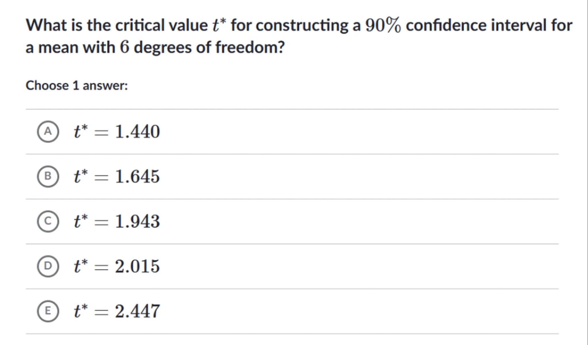 What is the critical value for constructing a confidence interval for a mean with 6 degrees of freedom?