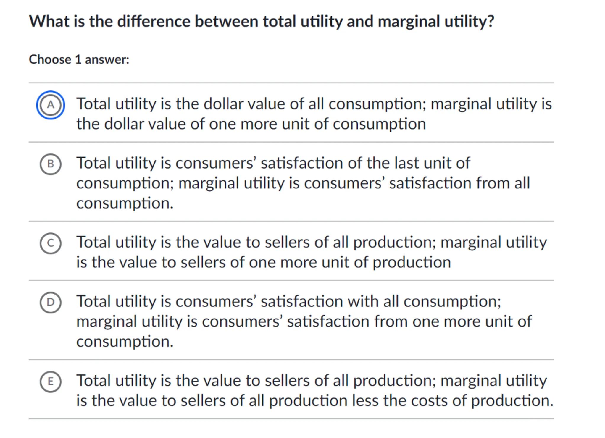 (A) Total utility is the dollar value of all consumption; marginal utility is the dollar value of one more unit of consumption