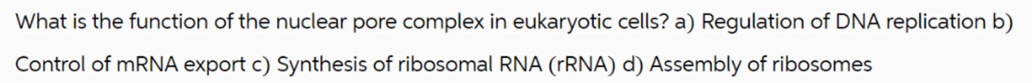 What is the function of the nuclear pore complex in eukaryotic cells? a) Regulation of DNA replication b) Control of mRNA export c) Synthesis of ribosomal RNA (rRNA) d) Assembly of ribosomes