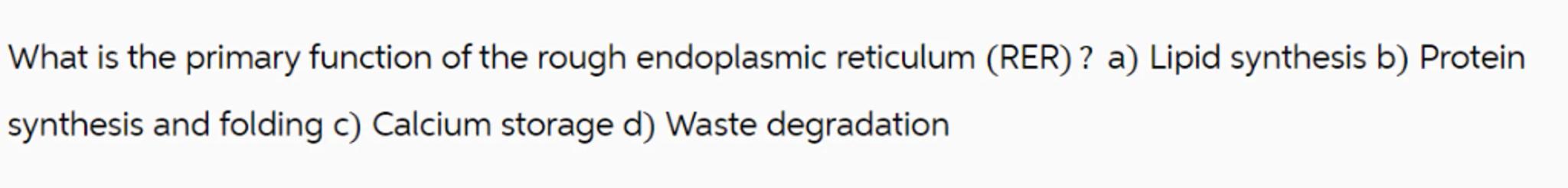 What is the primary function of the rough endoplasmic reticulum (RER)? a) Lipid synthesis b) Protein synthesis and folding c) Calcium storage d) Waste degradation