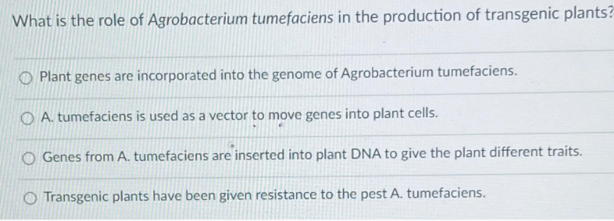 Genes from A. tumefaciens are inserted into plant DNA to give the plant different traits.