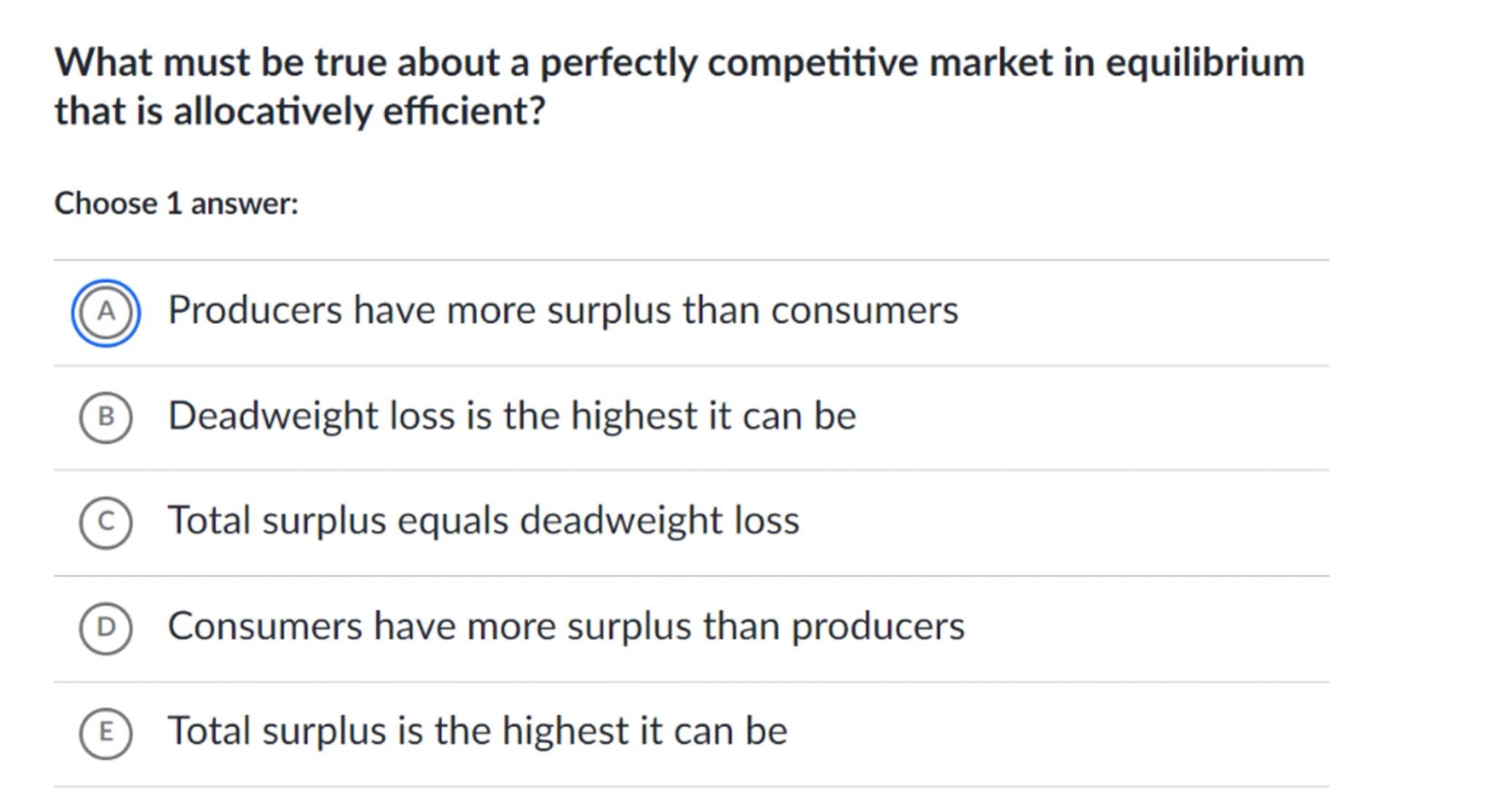 What must be true about a perfectly competitive market in equilibrium that is allocatively efficient?