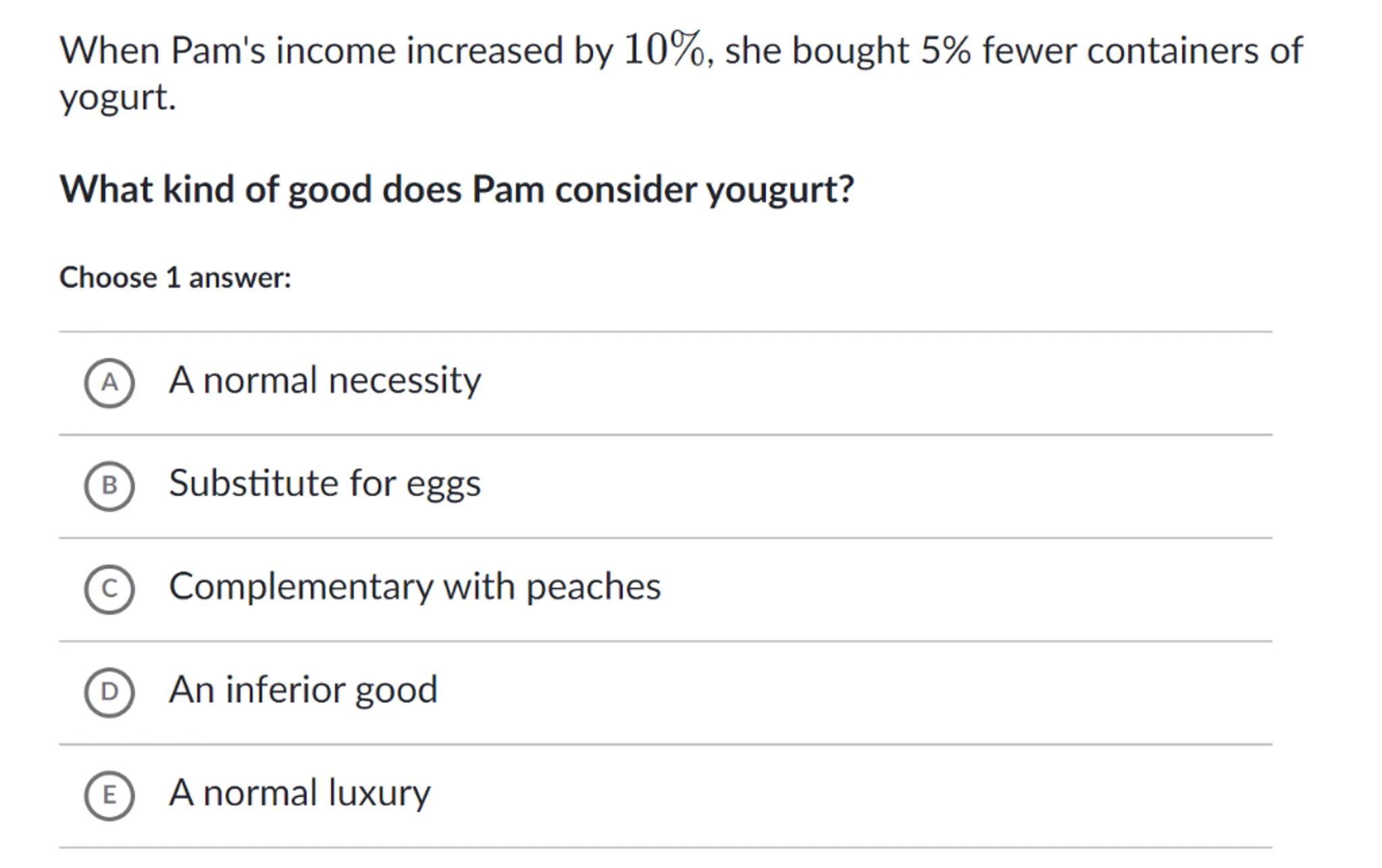 When Pam's income increased by , she bought fewer containers of yogurt.