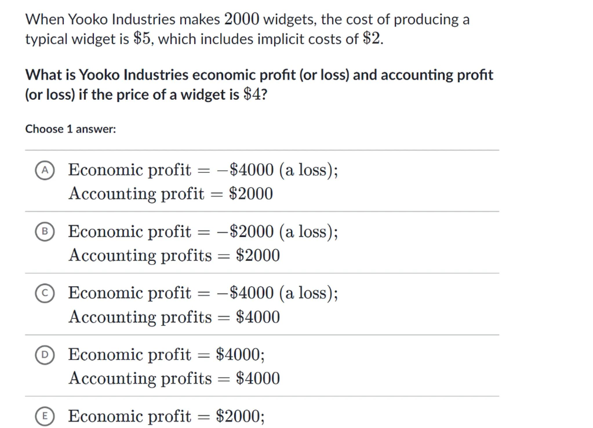 When Yooko Industries makes 2000 widgets, the cost of producing a typical widget is , which includes implicit costs of .
