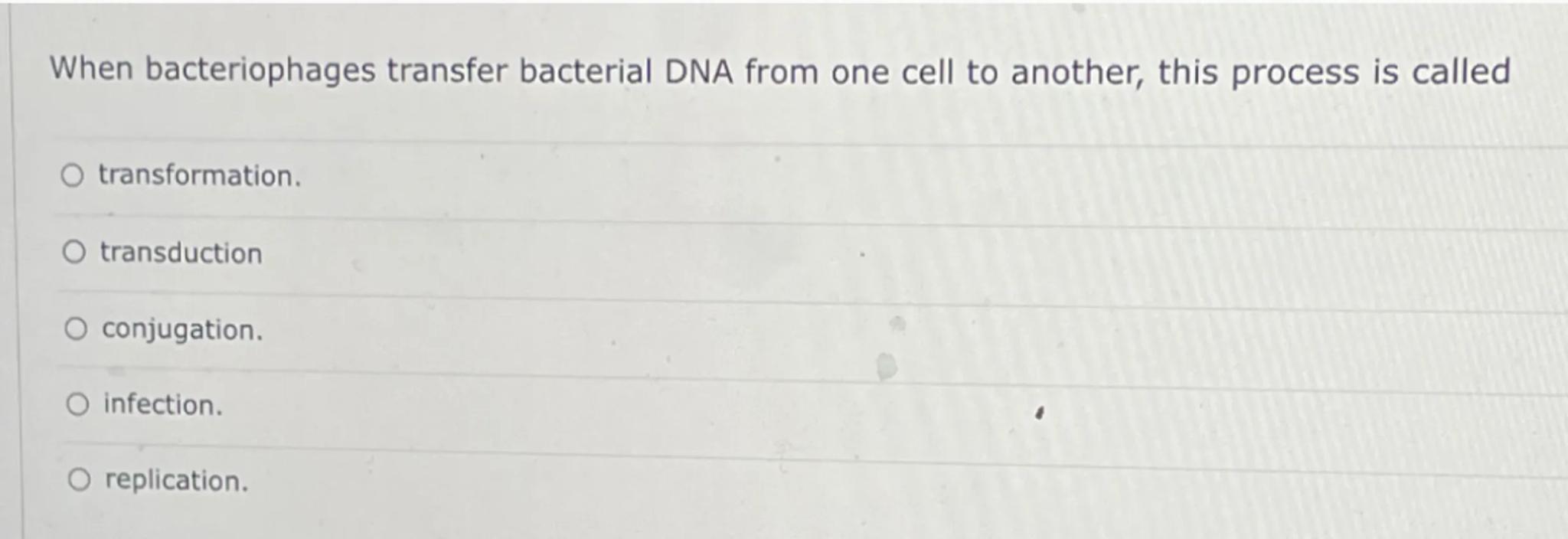 When bacteriophages transfer bacterial DNA from one cell to another, this process is called
