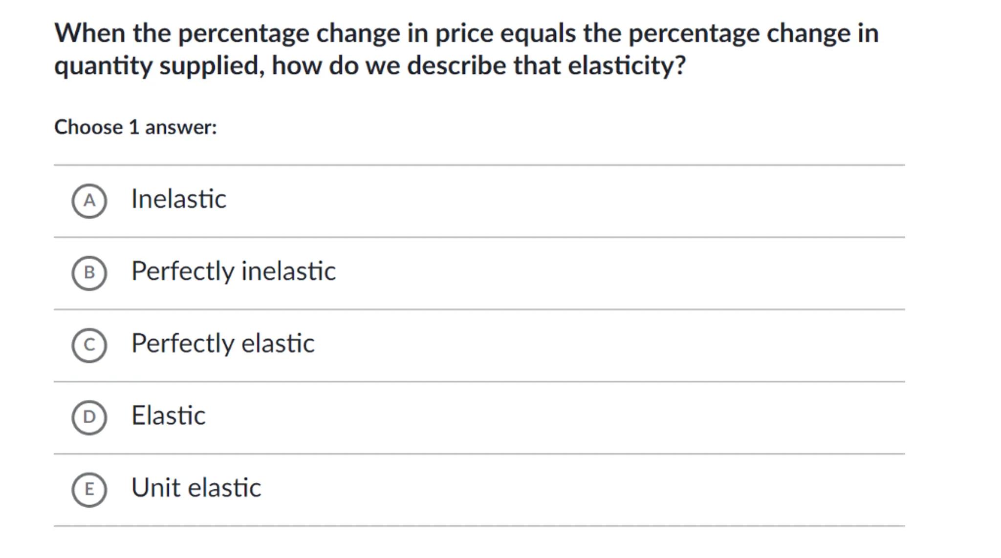 When the percentage change in price equals the percentage change in quantity supplied, how do we describe that elasticity?