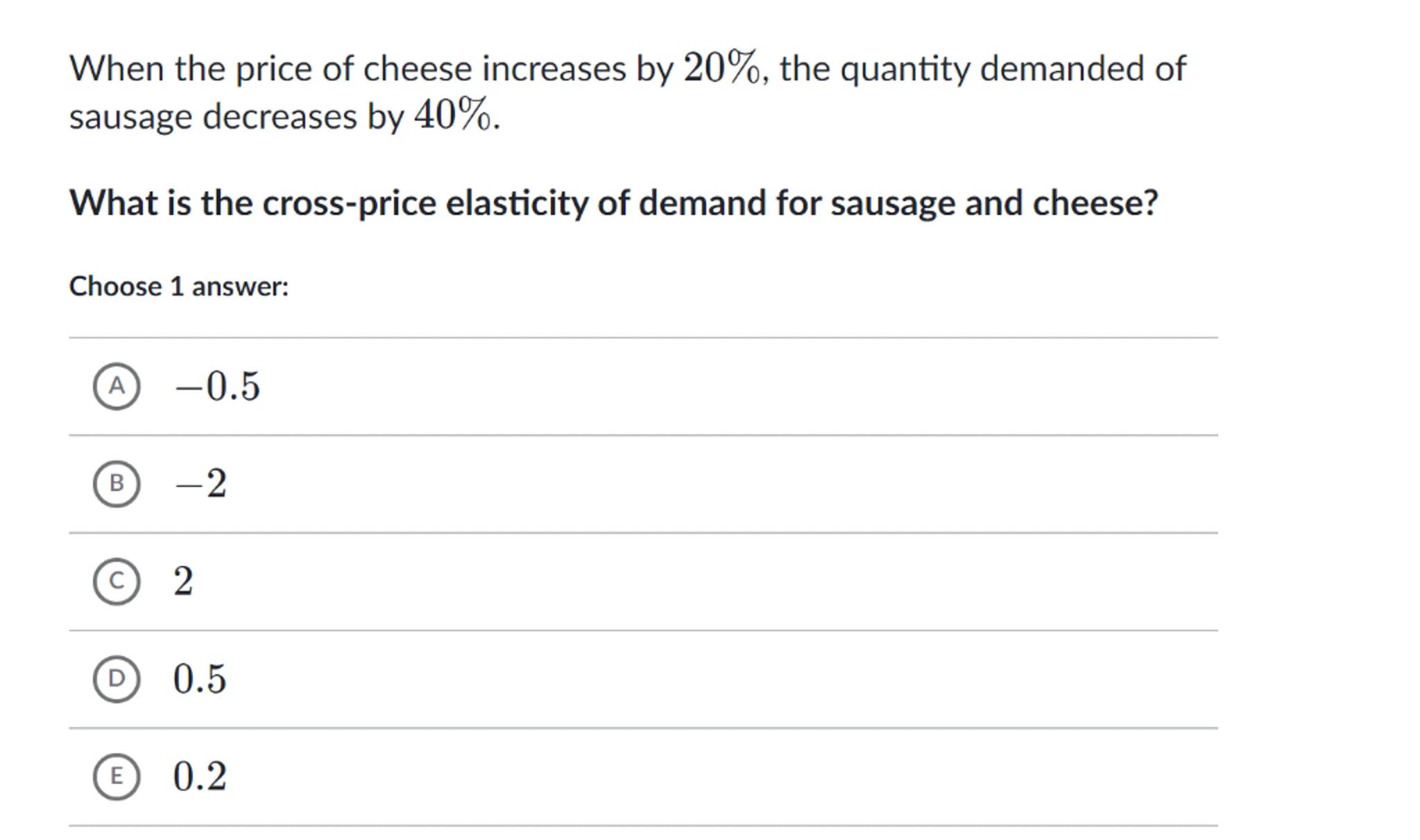 When the price of cheese increases by , the quantity demanded of sausage decreases by .