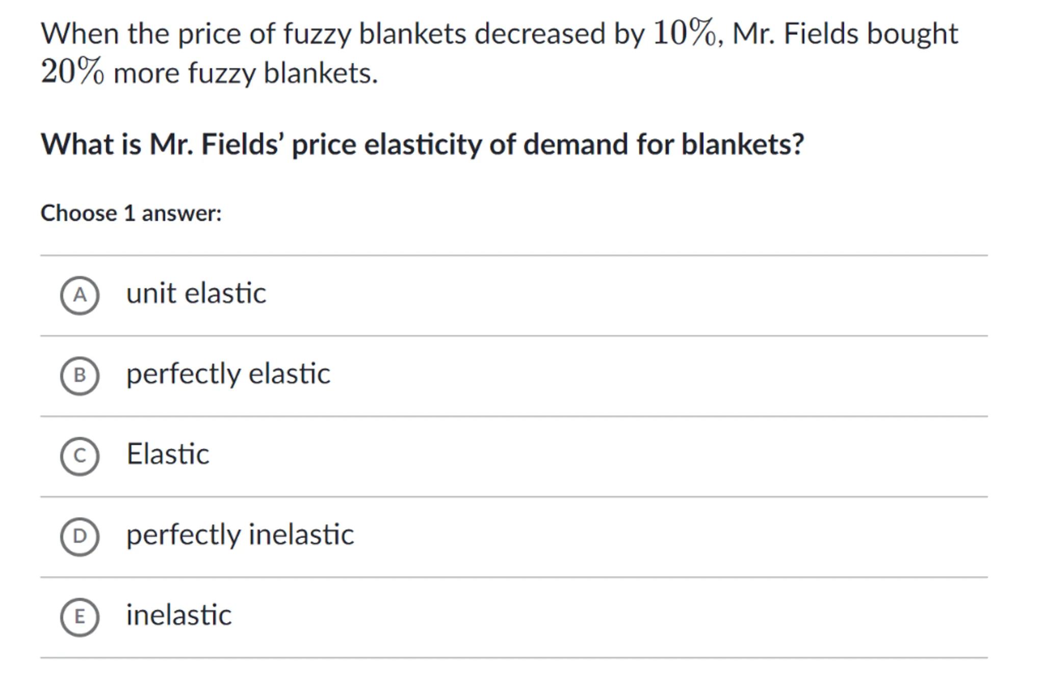 When the price of fuzzy blankets decreased by , Mr. Fields bought more fuzzy blankets.