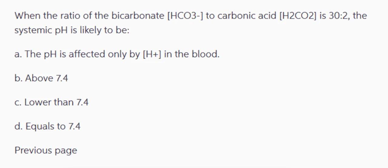 When the ratio of the bicarbonate [HCO3-] to carbonic acid is , the systemic is likely to be: