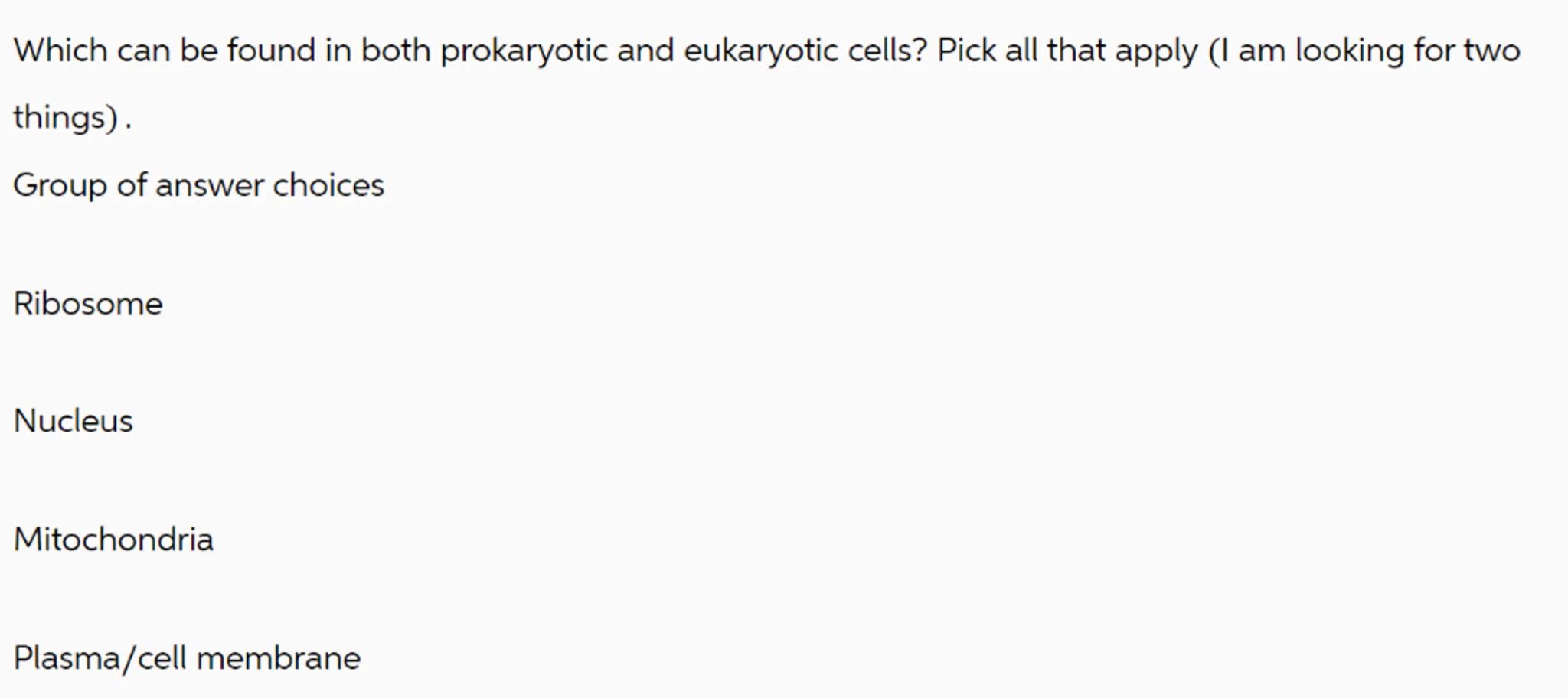 Which can be found in both prokaryotic and eukaryotic cells? Pick all that apply (I am looking for two things).