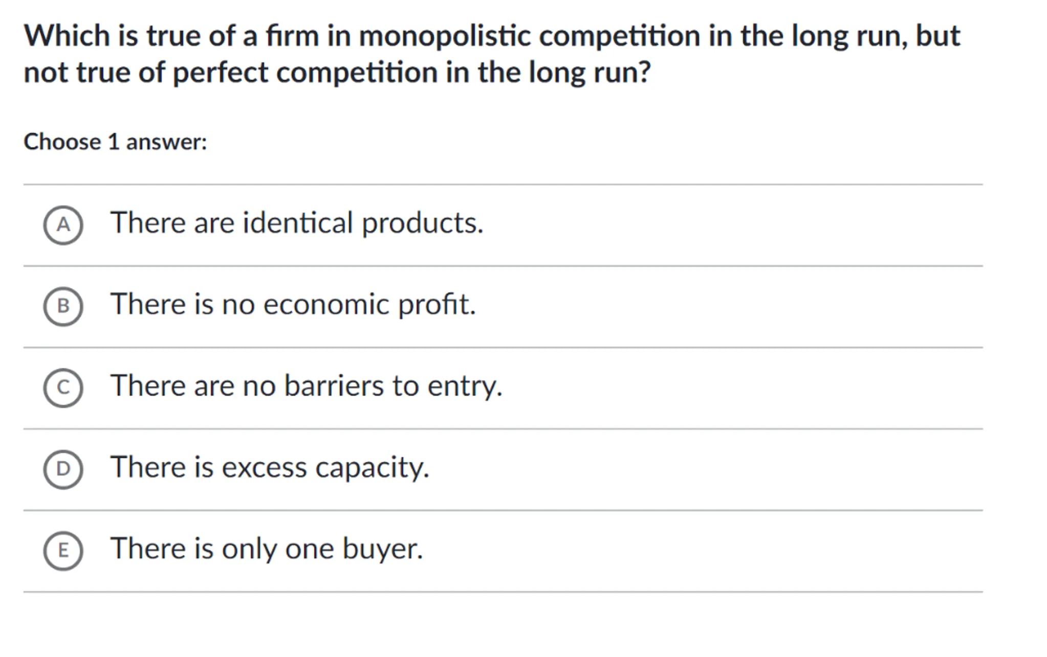 Which is true of a firm in monopolistic competition in the long run, but not true of perfect competition in the long run?