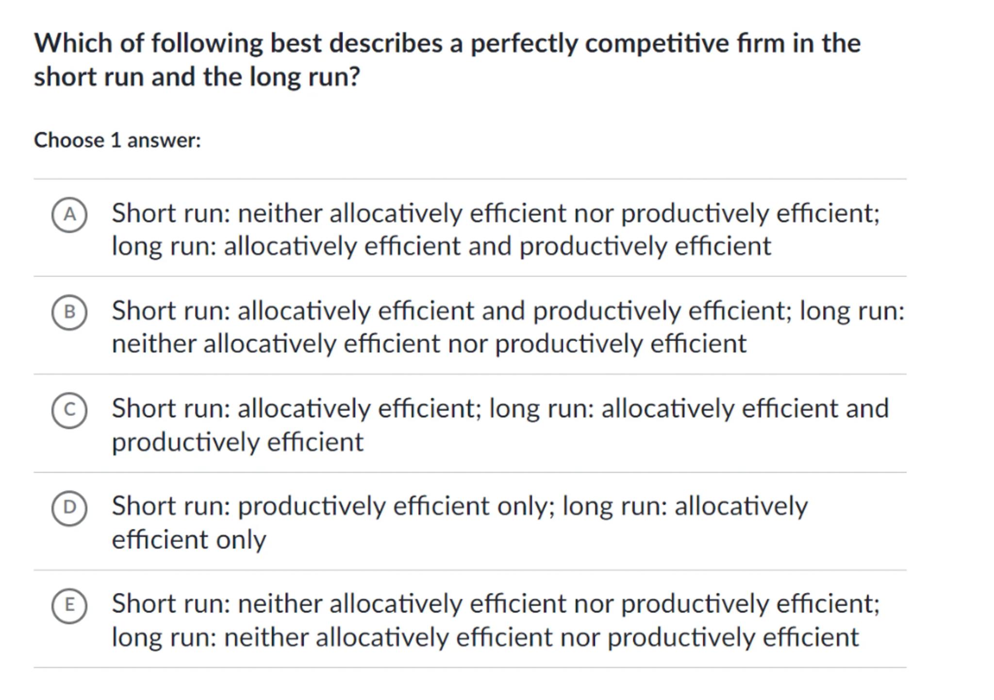 (c) Short run: allocatively efficient; long run: allocatively efficient and productively efficient