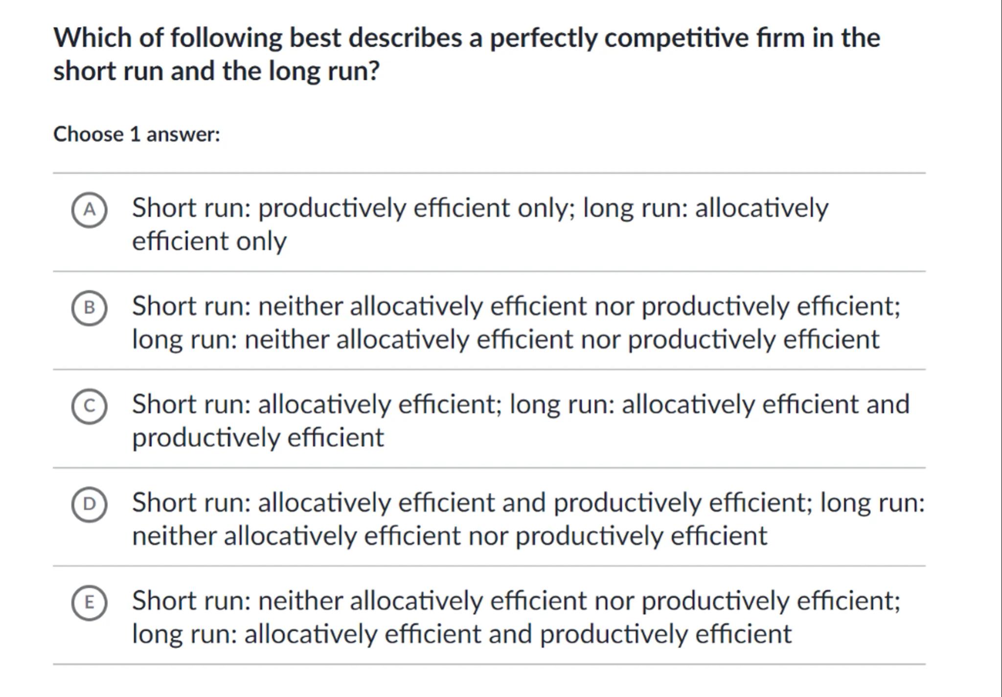 (A) Short run: productively efficient only; long run: allocatively efficient only