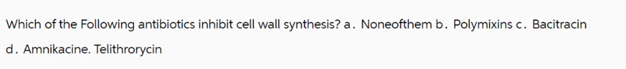 Which of the Following antibiotics inhibit cell wall synthesis? a. Noneofthem b. Polymixins c. Bacitracin