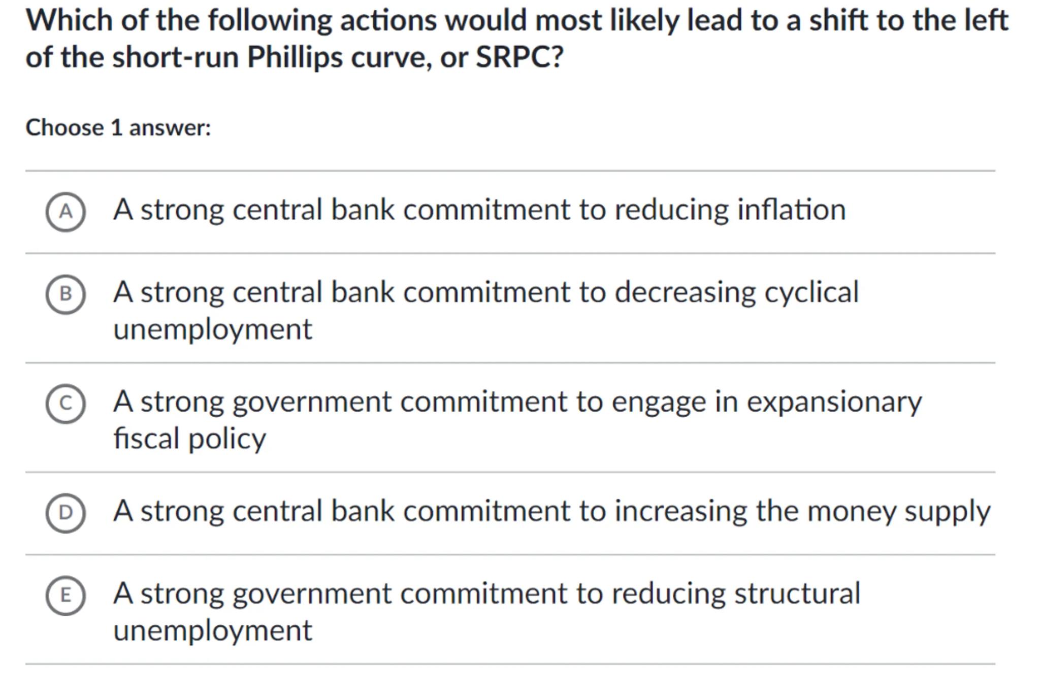 Which of the following actions would most likely lead to a shift to the left of the short-run Phillips curve, or SRPC?
