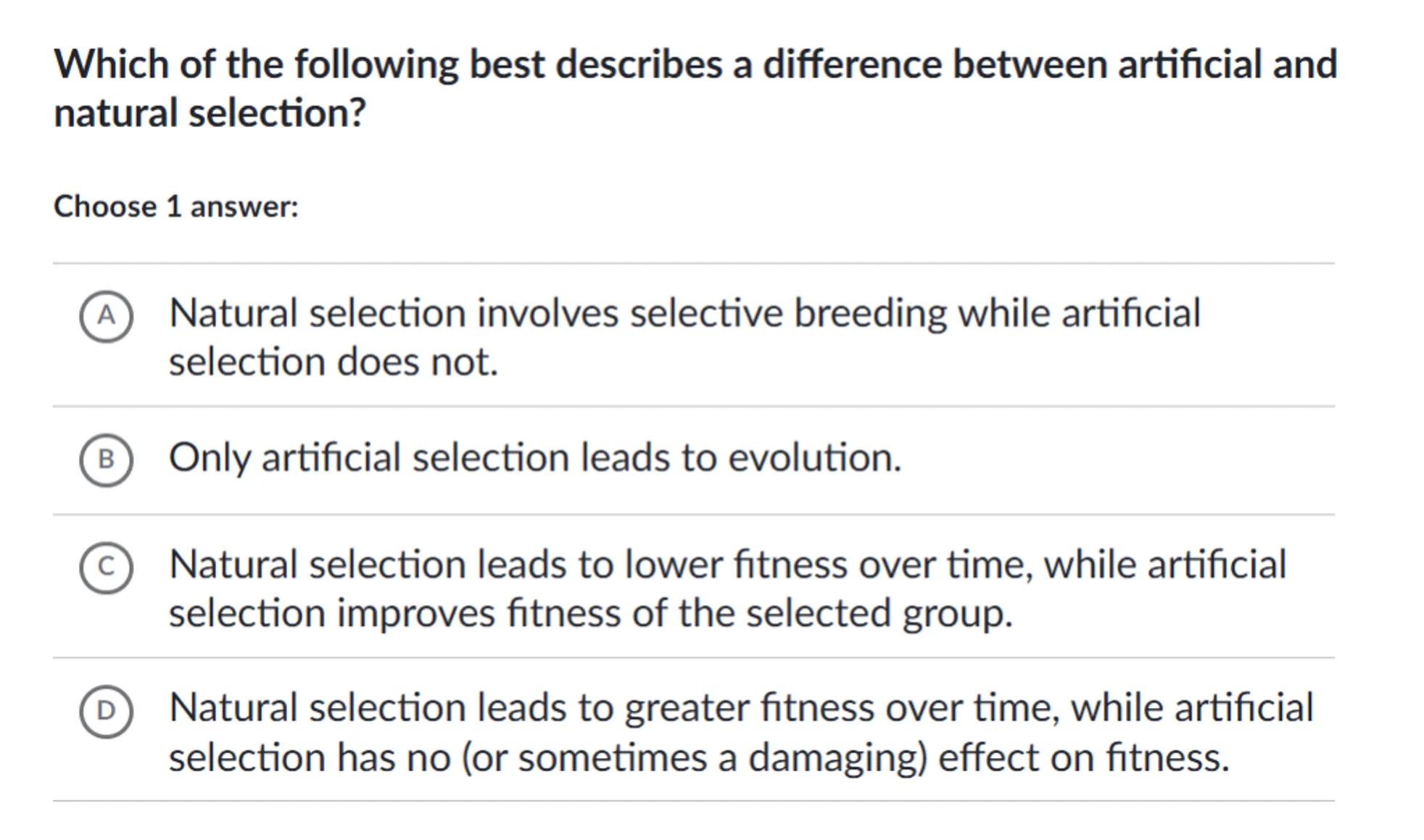 (D) Natural selection leads to greater fitness over time, while artificial selection has no (or sometimes a damaging) effect on fitness.