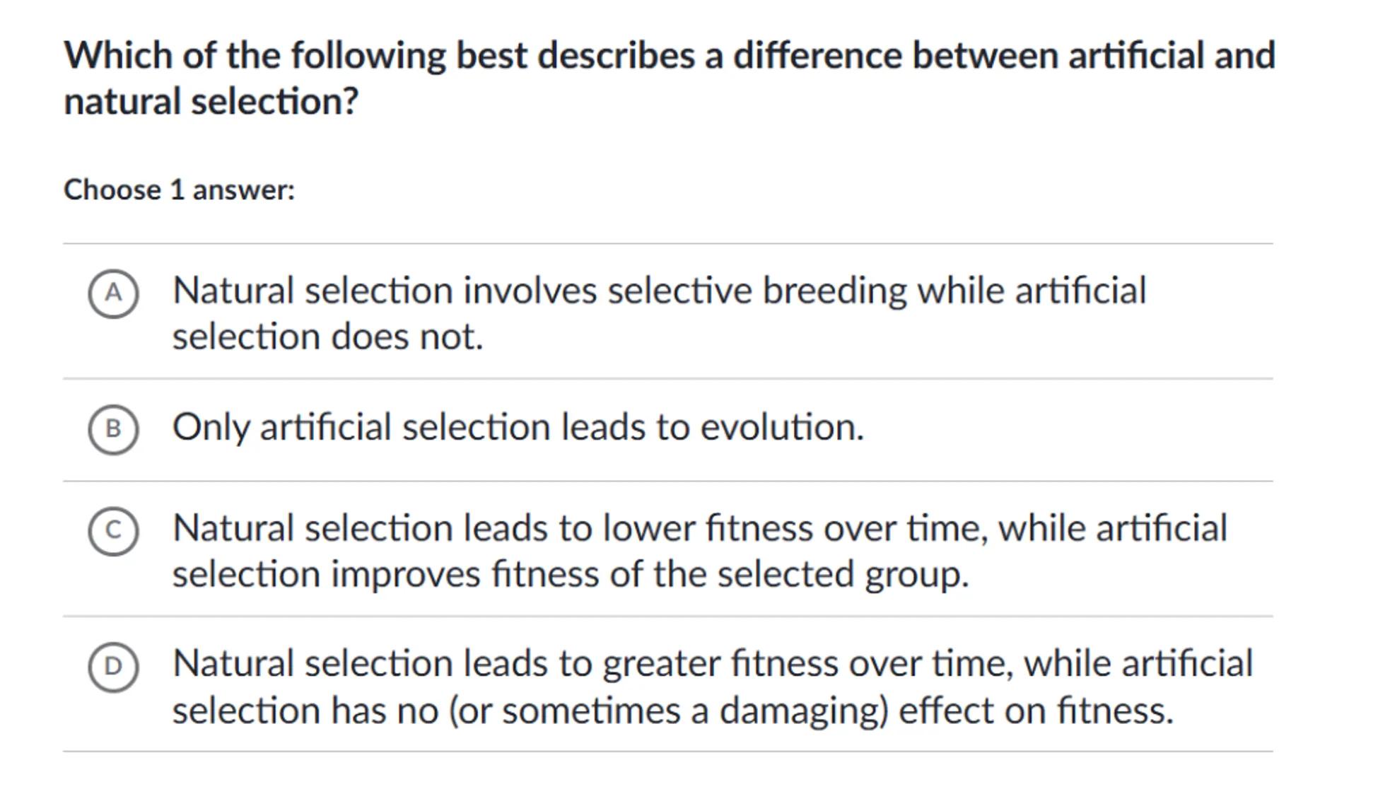 (D) Natural selection leads to greater fitness over time, while artificial selection has no (or sometimes a damaging) effect on fitness.