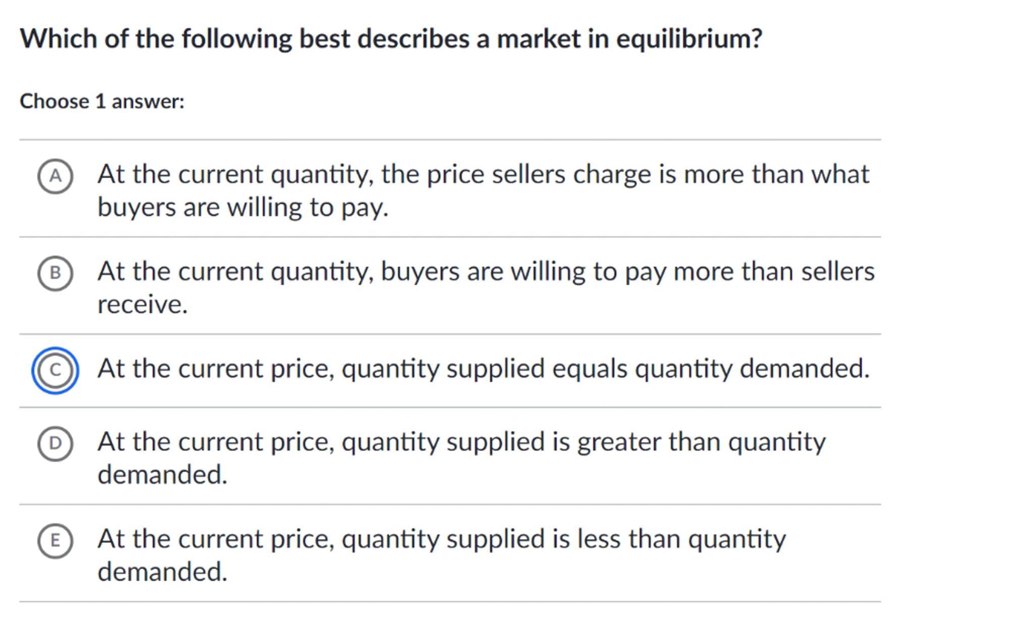 (A) At the current quantity, the price sellers charge is more than what buyers are willing to pay.