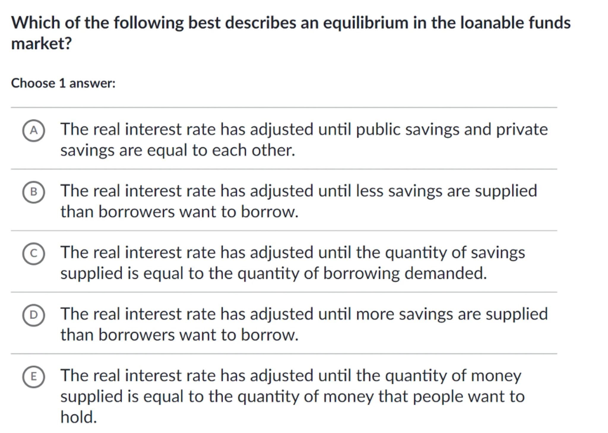 Which of the following best describes an equilibrium in the loanable funds market?