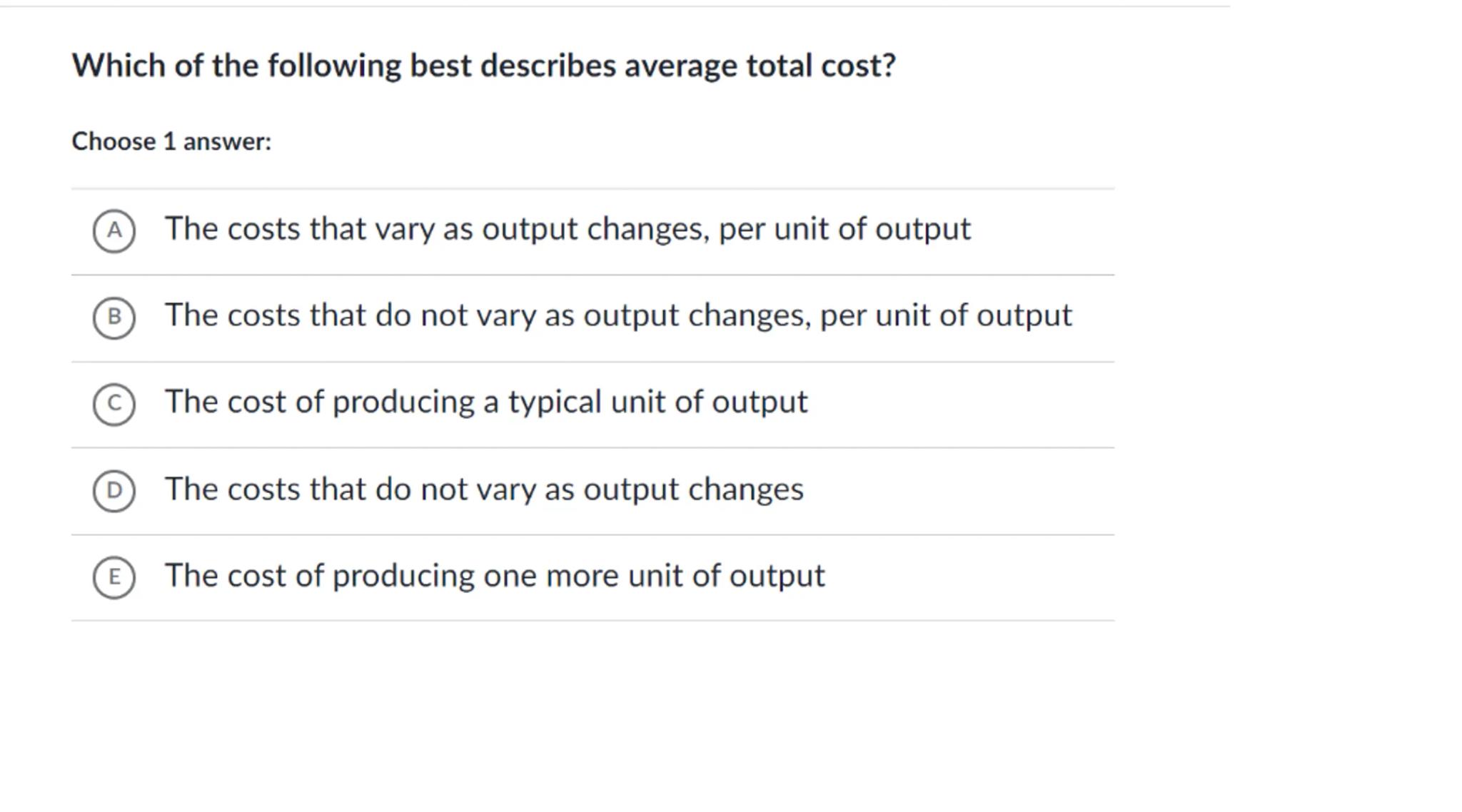 Which of the following best describes average total cost?