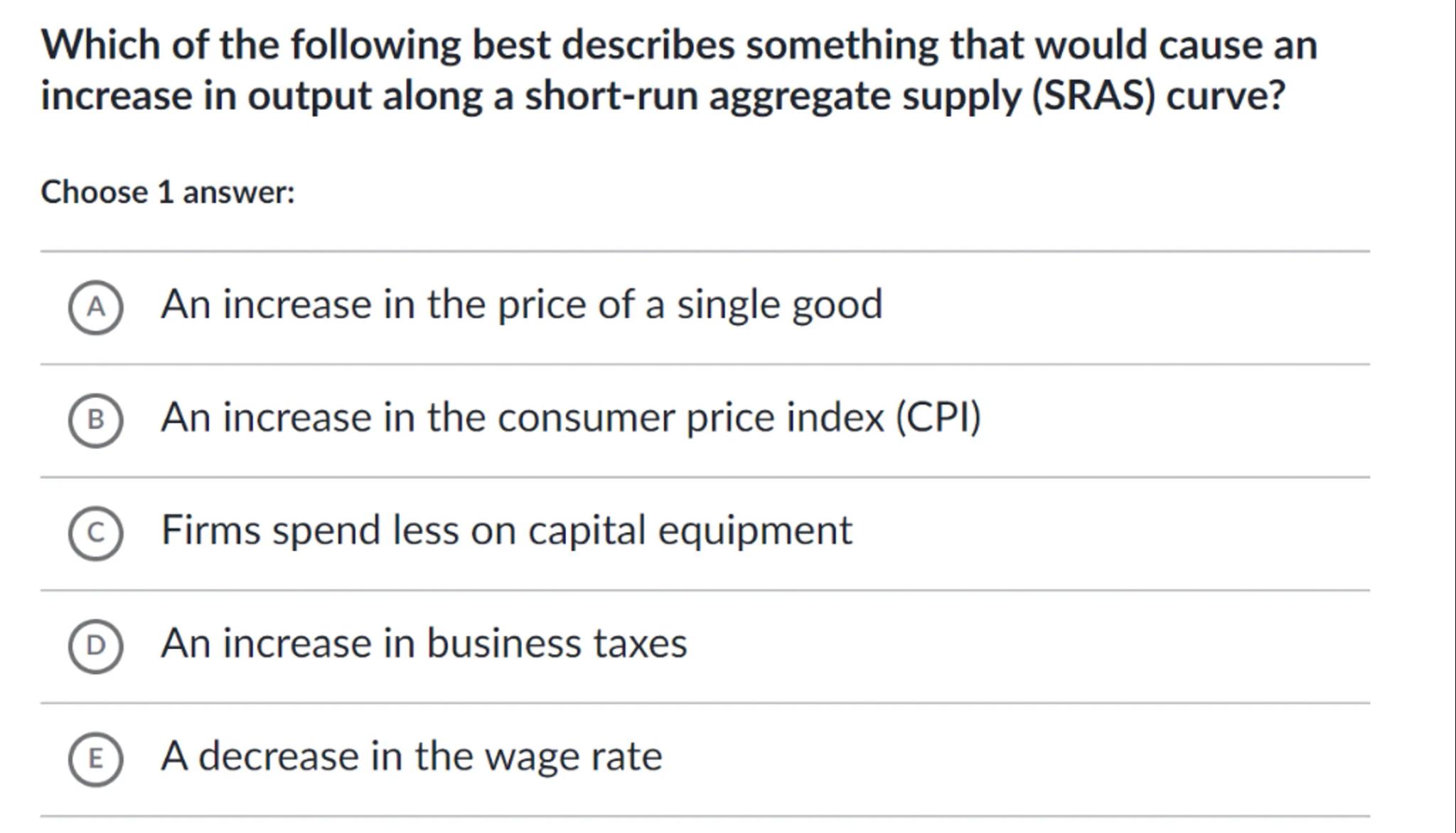 Which of the following best describes something that would cause an increase in output along a short-run aggregate supply (SRAS) curve?
