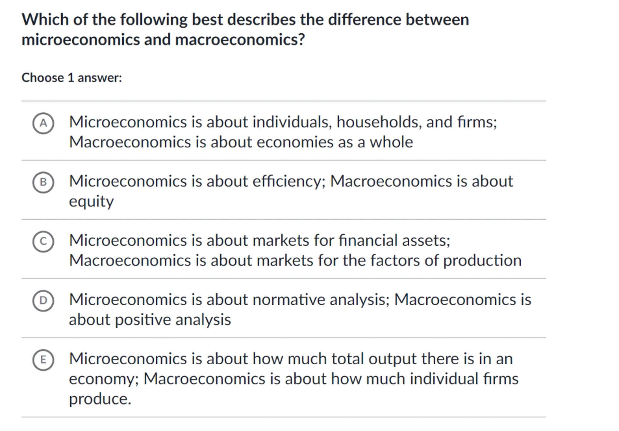 (A) Microeconomics is about individuals, households, and firms; Macroeconomics is about economies as a whole