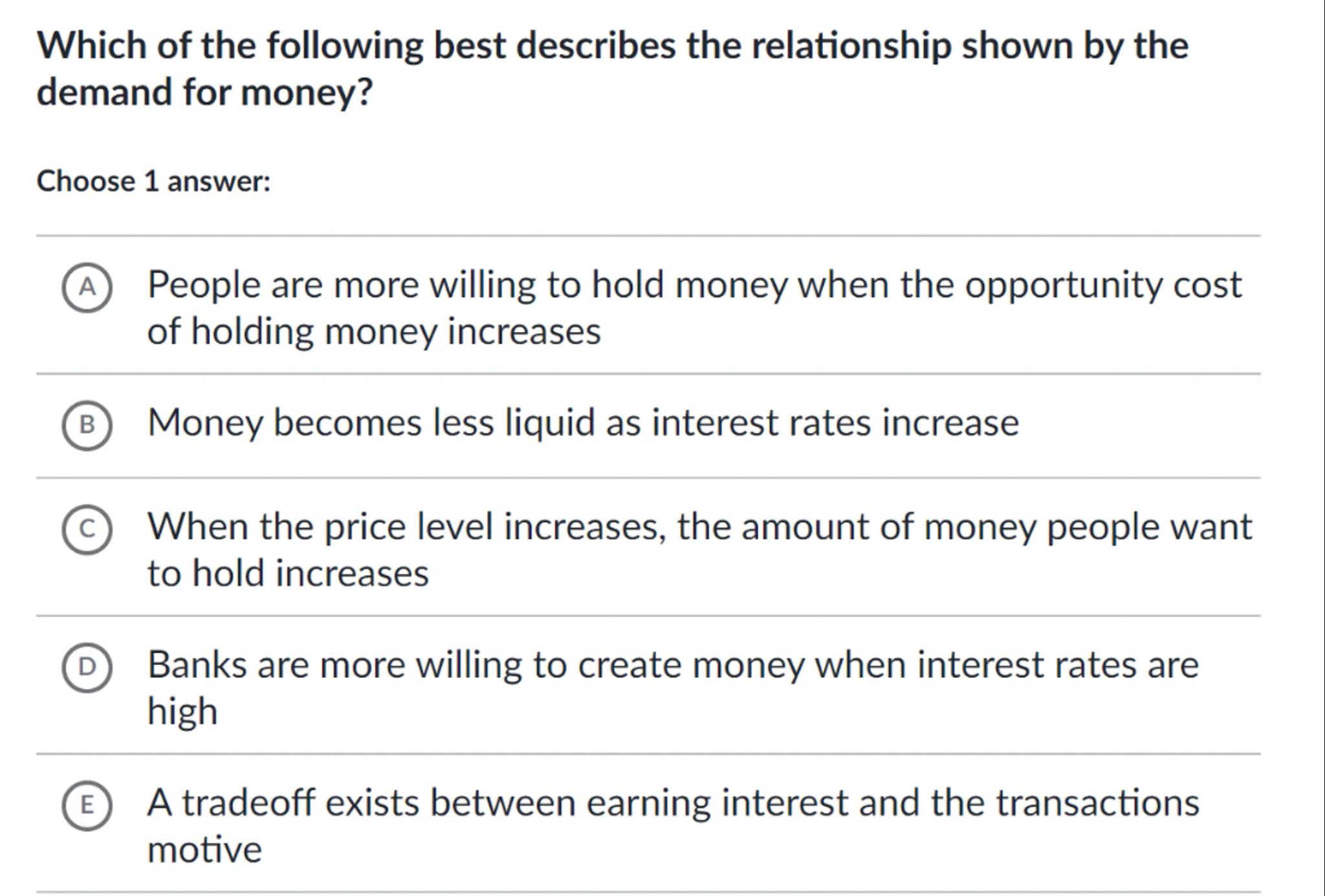 (A) People are more willing to hold money when the opportunity cost of holding money increases