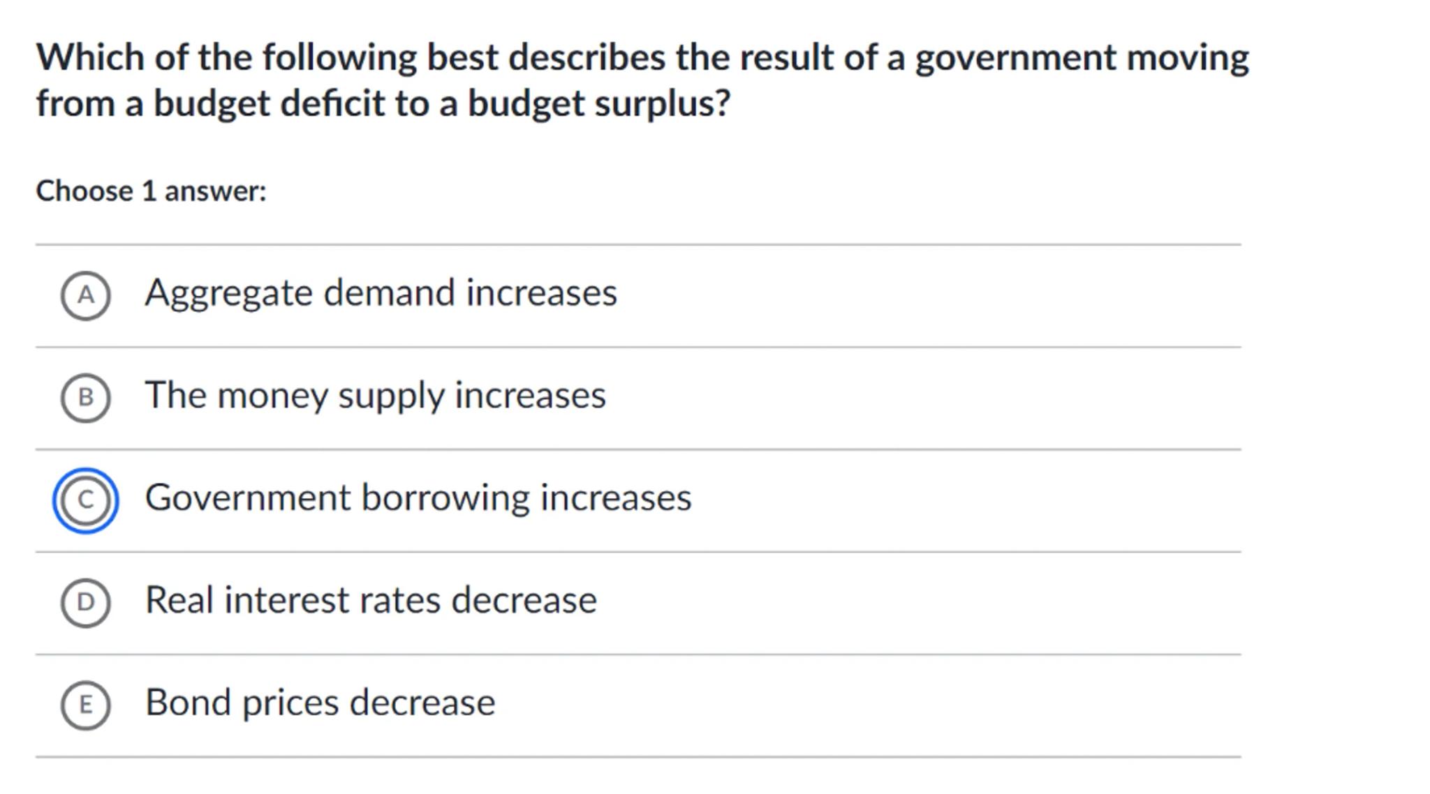 Which of the following best describes the result of a government moving from a budget deficit to a budget surplus?