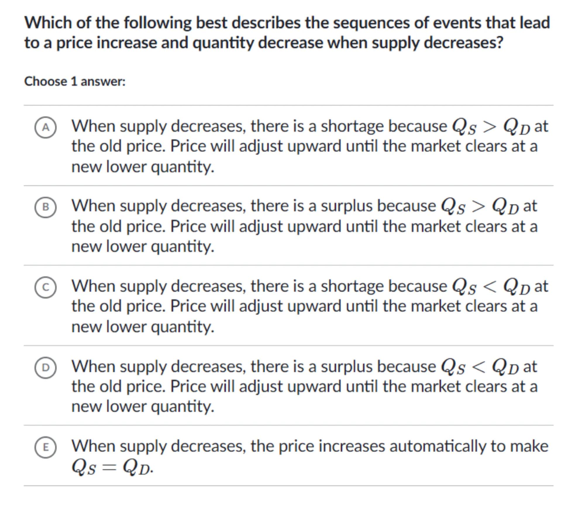 (A) When supply decreases, there is a shortage because at the old price. Price will adjust upward until the market clears at a new lower quantity.
