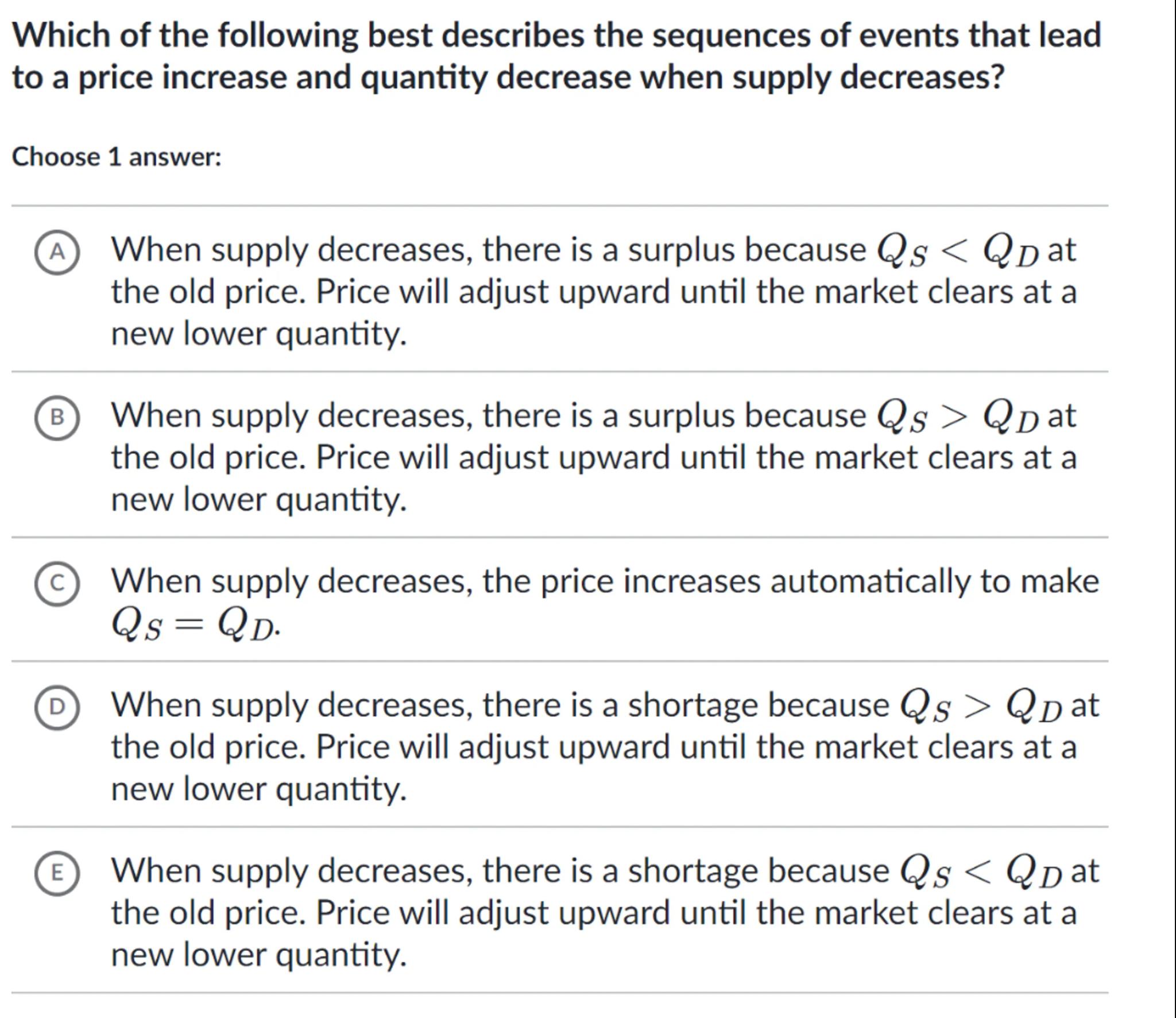 (E) When supply decreases, there is a shortage because at the old price. Price will adjust upward until the market clears at a new lower quantity.