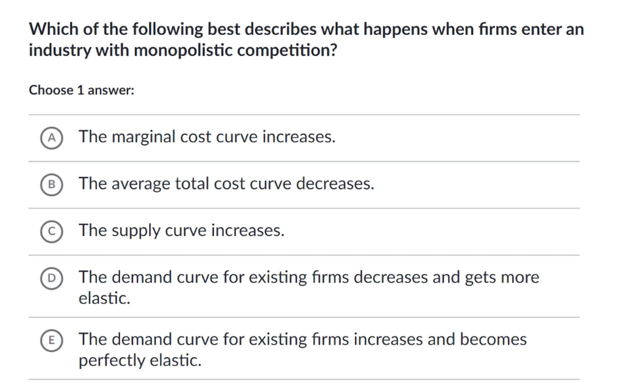 Which of the following best describes what happens when firms enter an industry with monopolistic competition?