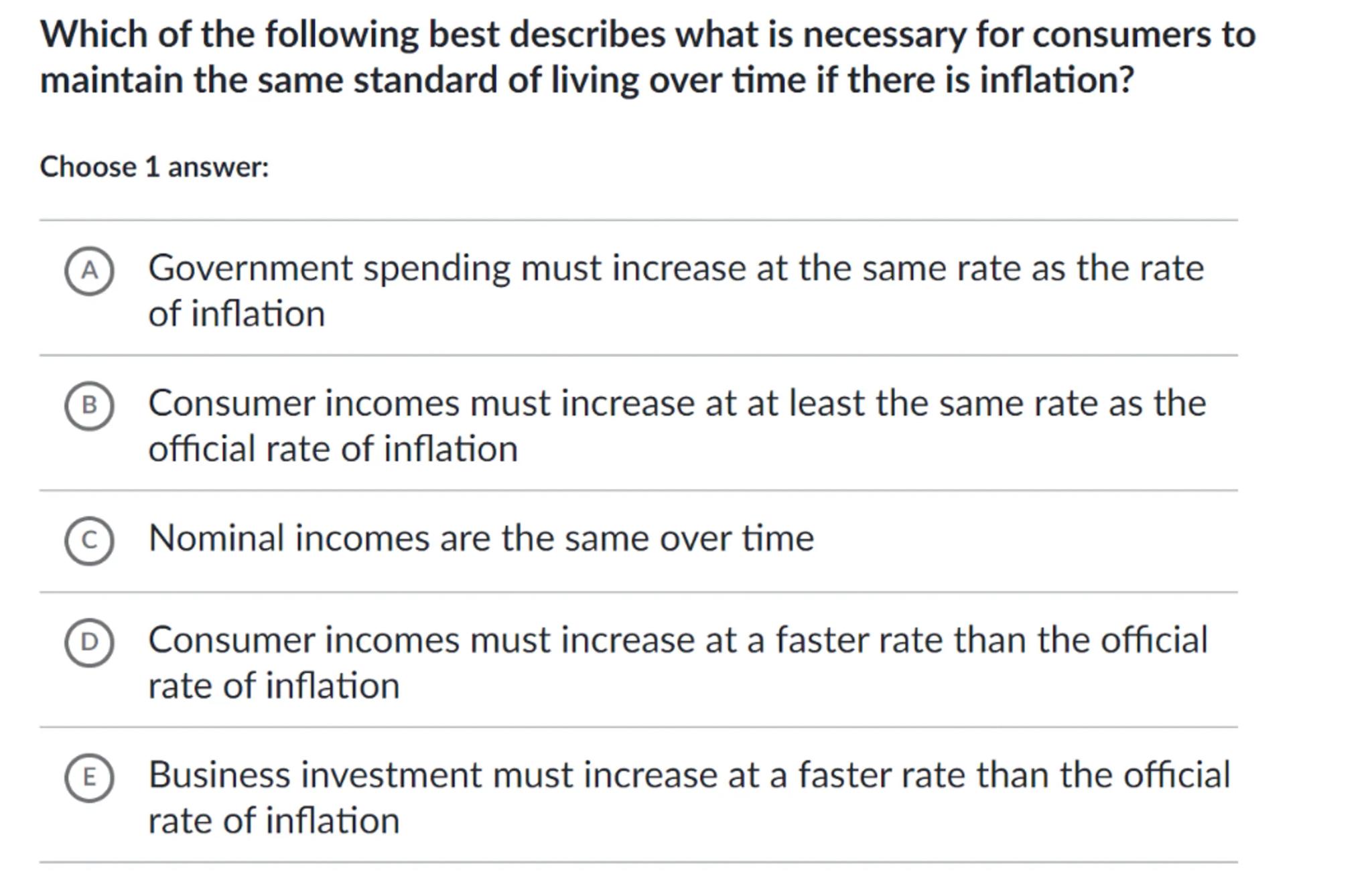 (D) Consumer incomes must increase at a faster rate than the official rate of inflation