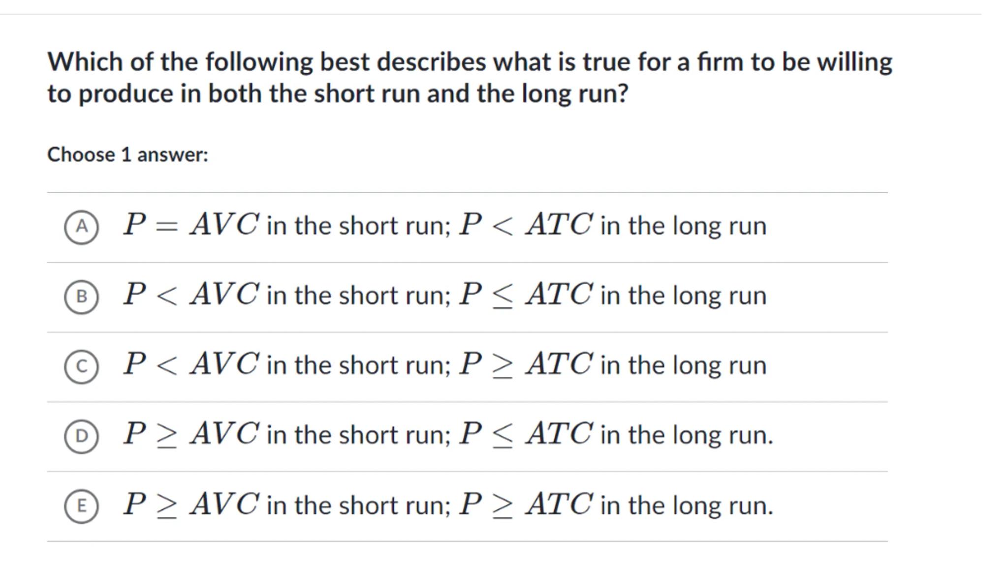 Which of the following best describes what is true for a firm to be willing to produce in both the short run and the long run?