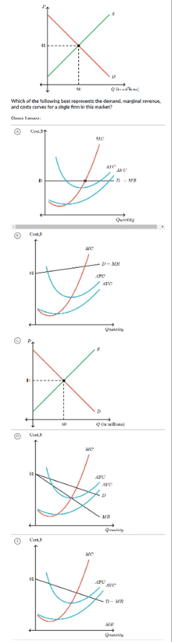 Which of the following best represents the demand, marginal revenue, and corts curves for a single firm In this market?