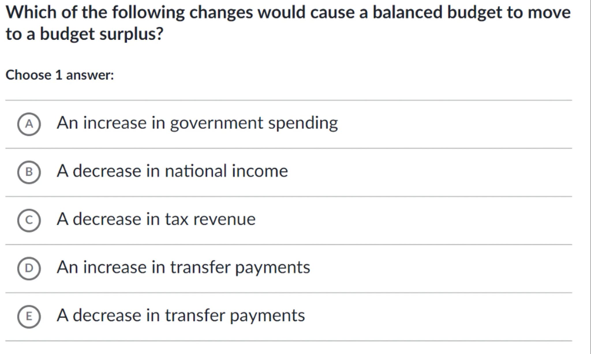 Which of the following changes would cause a balanced budget to move to a budget surplus?