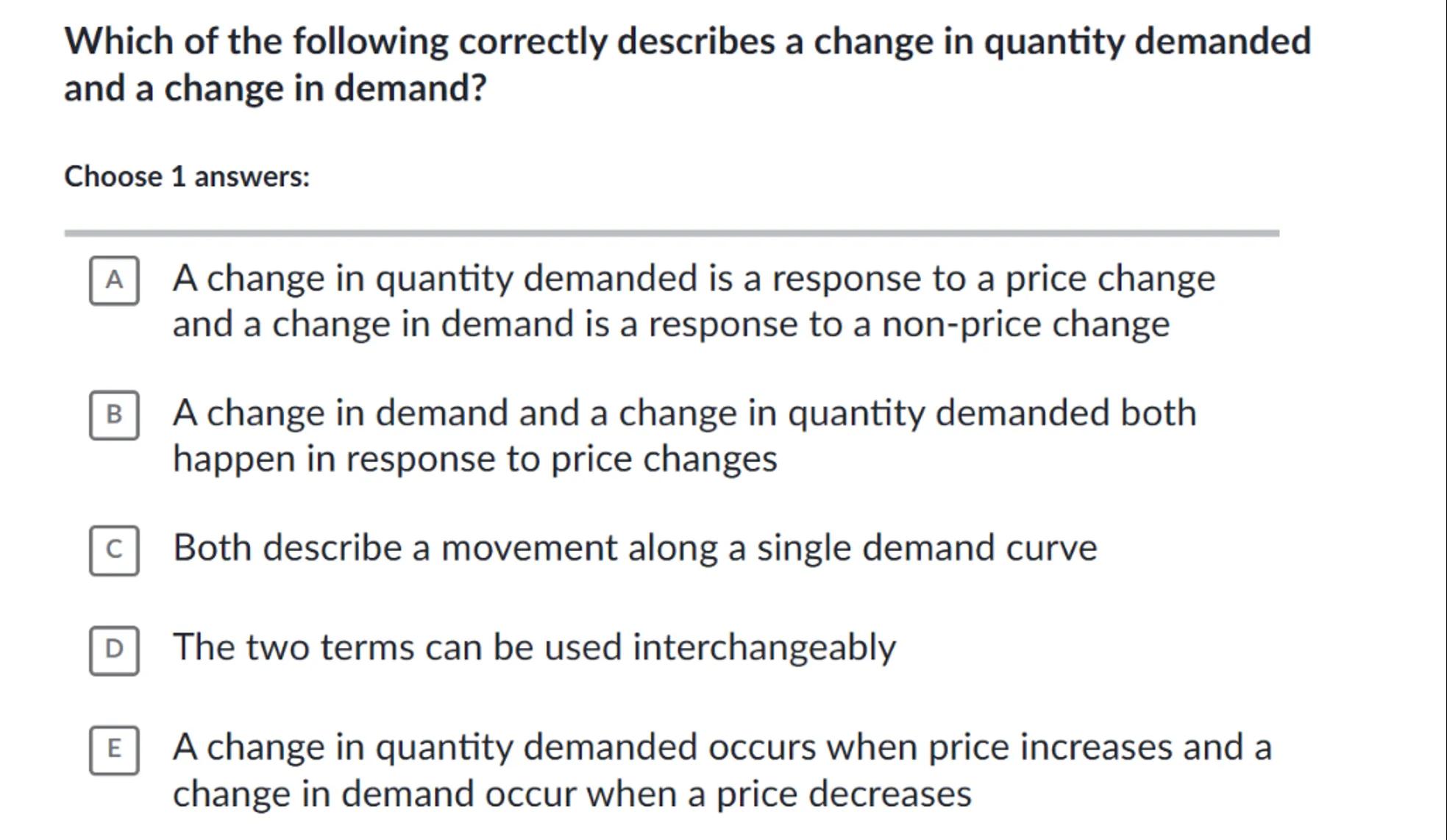 E A change in quantity demanded occurs when price increases and a change in demand occur when a price decreases