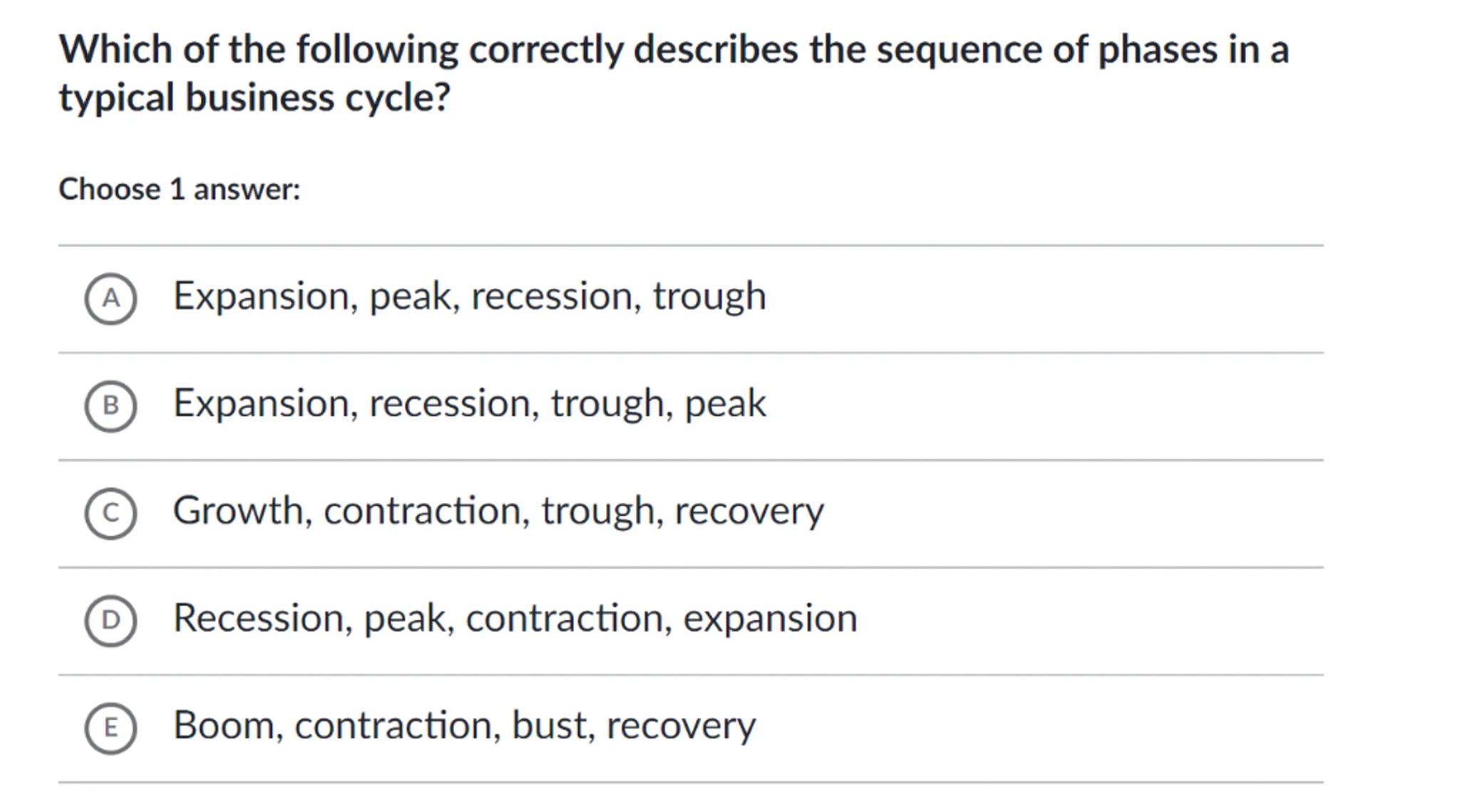 Which of the following correctly describes the sequence of phases in a typical business cycle?